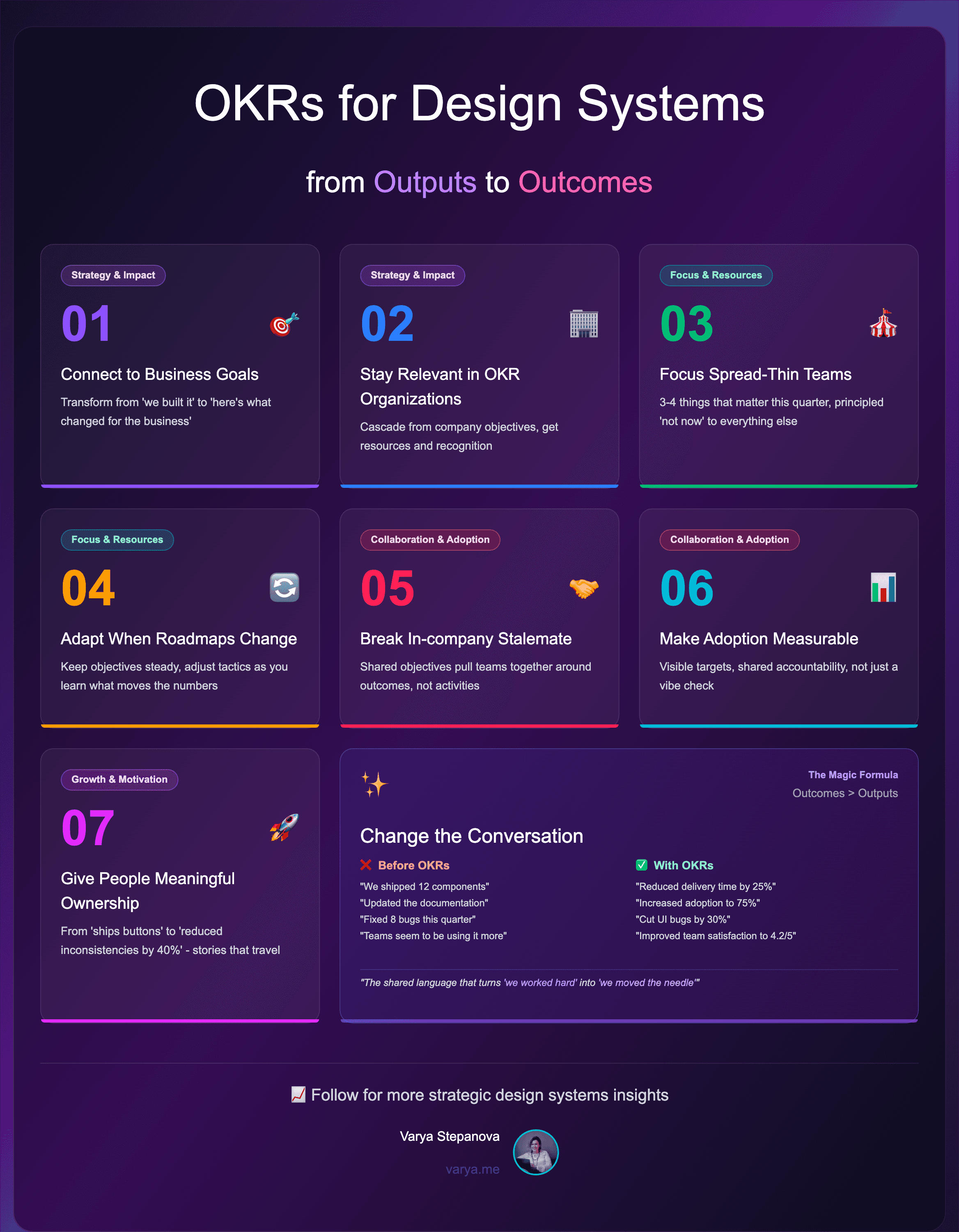 With OKRs, individuals gain concrete outcomes to take ownership of and achievements to highlight, transforming someone from 'the person responsible for buttons' into 'the individual who decreased design inconsistencies by 40%' or 'the one who halved adoption time for three separate teams,'. These narratives gain visibility throughout the organization, supporting recognition, performance reviews, and advancement discussions. Also, they cultivate transferable skills like setting bold goals, tracking progress, and articulating results.